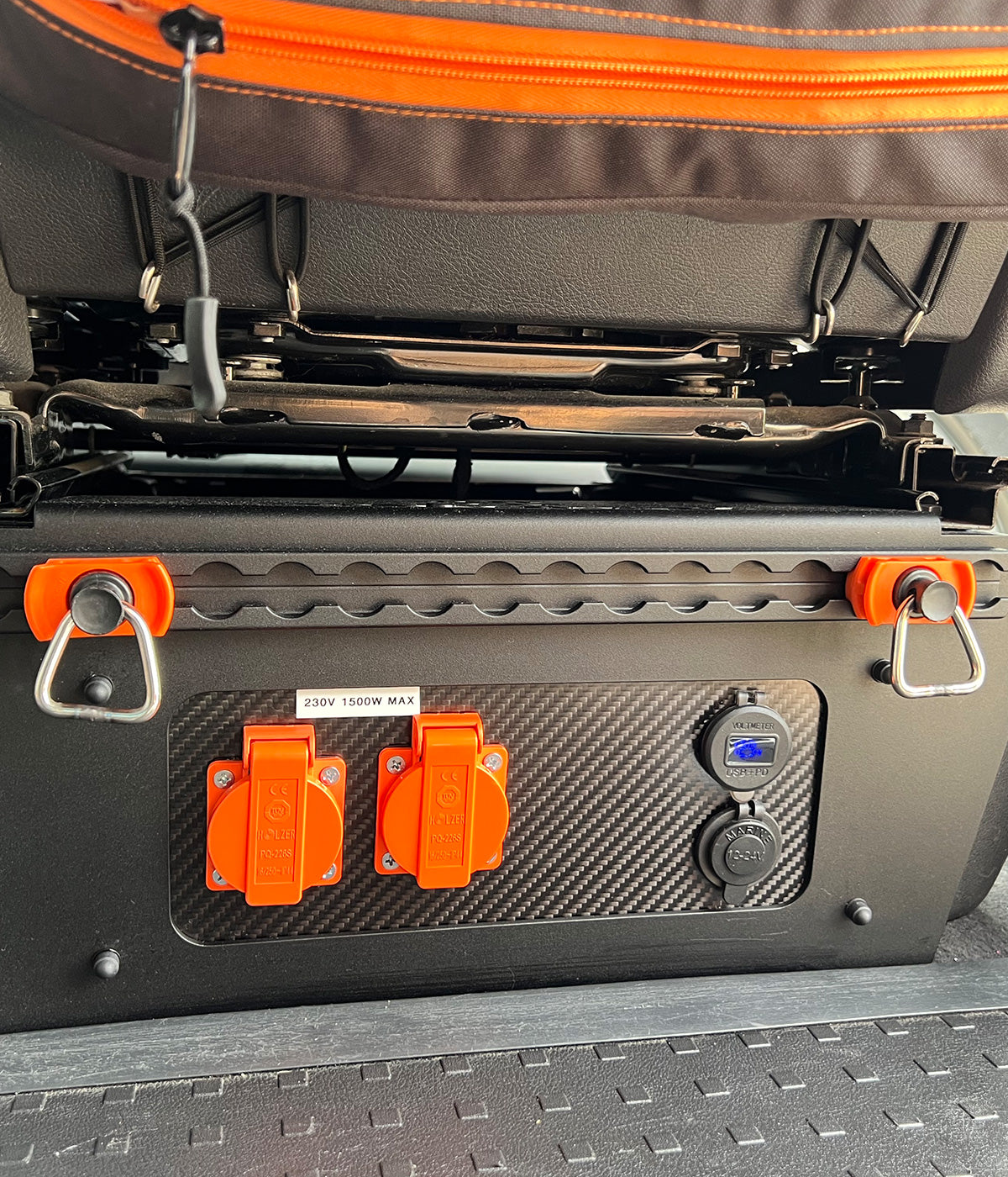 Mit Anschlüssen direkt unterhalb des Sitzbereiches kannst du beim gedrehten Beifahrersitz Laptop/Tablet/Kamera direkt am Platz laden. Das Kabel verschwindet nach unten, statt über Möbel, Boden oder Cockpit zu laufen. Das fühlt sich im Alltag und auf Reisen deutlich „aufgeräumter“ an und du stolperst auch nicht darüber.