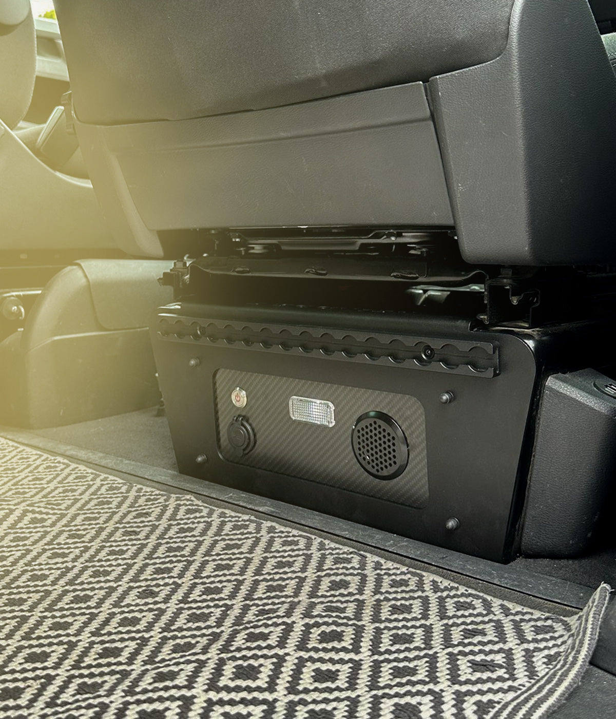 Bei vielen VW T5/T6/T6.1 Camper-Setups sitzt die Zweitbatterie unter dem Fahrersitz (oder sitznah auf der Fahrerseite). Genau deshalb ist die Sitzkonsole des Beifahrersitzes ein logischer Ort für zusätzliche Anschlüsse: kurze Leitungslängen, weniger Verluste, weniger „Kabel quer durchs Auto“.