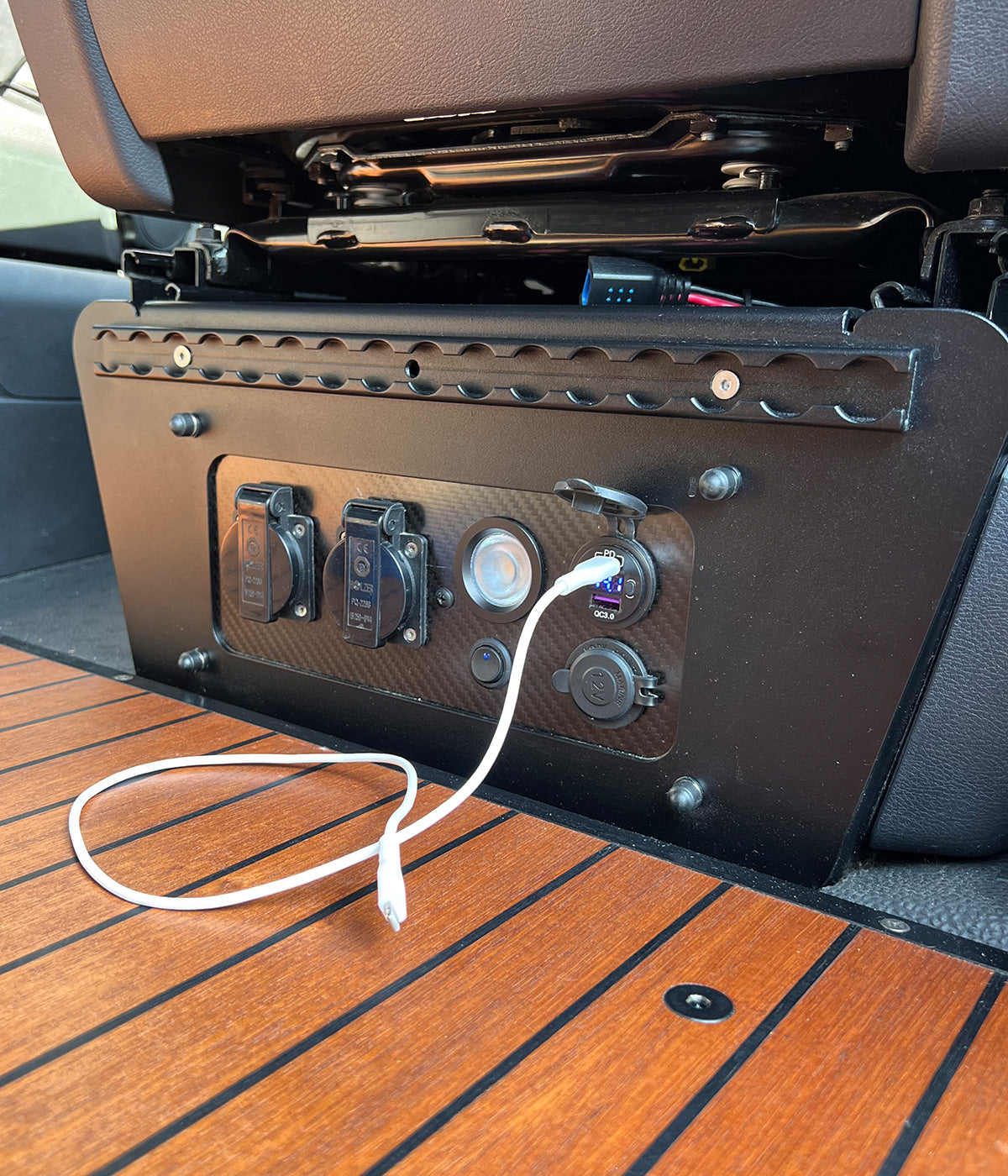 Oh yeah. Sobald meine Schiebetür offen ist, werde ich jetzt öfters auf meine Elektrik angesprochen. Die Bearbeitung des Carbon-Panel hat ein bisschen Arbeiten gemacht, aber für mich kein Problem, da ich gern am Bus bastle und nun eine individuelle Steckdosen-Lösung für mich habe.