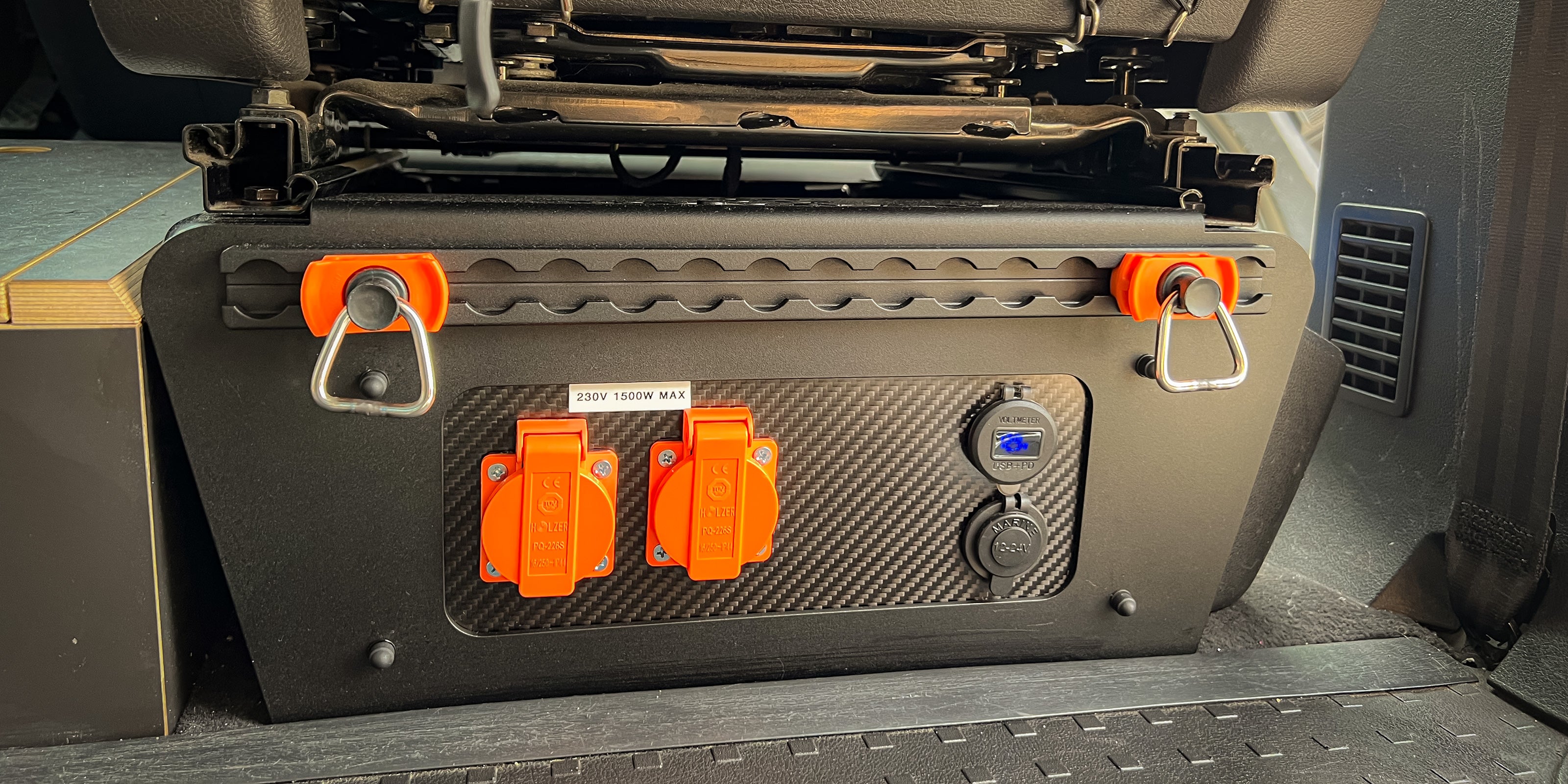 Oh yeah. Sobald meine Schiebetür offen ist, werde ich jetzt öfters auf meine Konsolenverkleidung angesprochen. Die Bearbeitung des Carbon-Panel hat ein bisschen Arbeiten gemacht, aber für mich kein Problem, da ich gern am Bus bastle und nun eine individuelle Steckdosen-Lösung für mich habe.